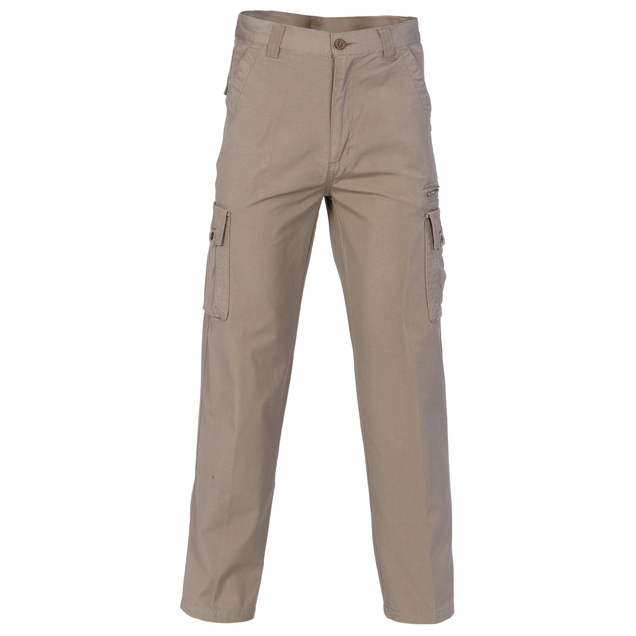 Two large cargo pockets, LHS hidden zip pocket, two side pockets, one flap back pocket with metal press stud closure. Comfort fit and casual style.